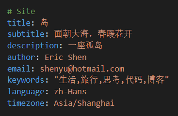 修改网站各种资料,例如标题、副标题和邮箱等个人资料,请修改站点根目录下的_config.yml